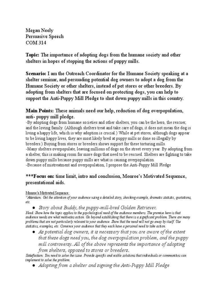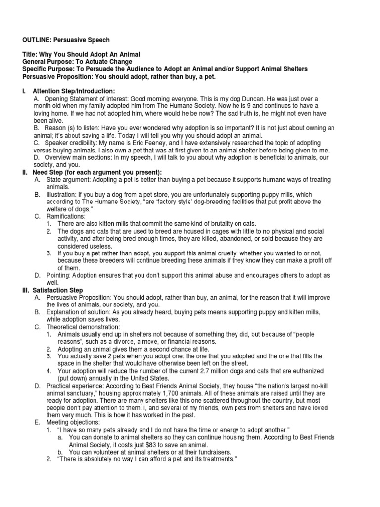 Persusaive Speech Why You Should Adopt A Pet Persuasive Speech 3 Argument Outline By Shelbie Moore I Introduction A Attention Getter Have You Ever Course Hero