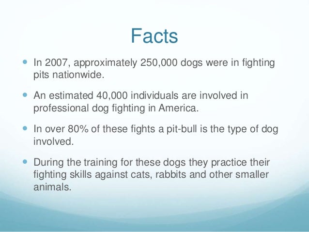 One of the most amazing facts about dog fighting is that this bloody sport is illegal in all the 50 states in America but still every year more than 1000 dogs are killed in various dog fighting events. Dogs used for fighting are typically raised in isolation so. Dog fighting is a supposed contest between dogs that is actually engineered by humans who are not worthy of the name.